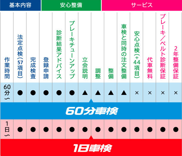 60分車検 1日車検 車検料 27,280円 27,280円 機器使用料 5,500円 5,500円 検査代行料 7,590円 7,590円 最大割引 −17,600円 −16,500円 自賠責保険 17,650円 17,650円 重量税 32,800円 32,800円 印紙代 1,800円 1,800円 割引後車検価格 75,020円 76,120円